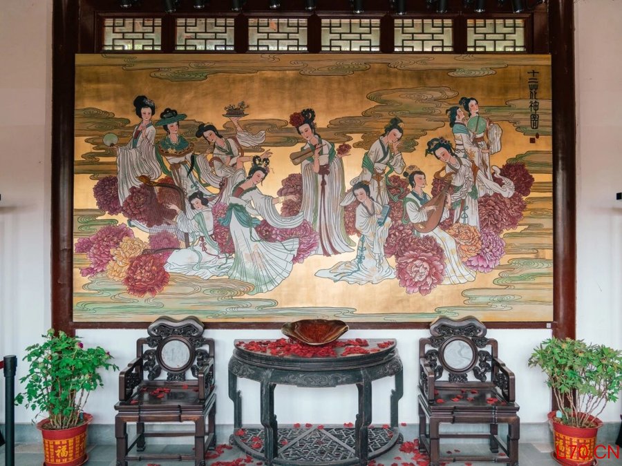 花神殿是古猗园传播花神民俗文化的主要场所,殿内展示了多款艺术作品,包括上海款彩非遗传承人项军等创作的《十二花神图》漆画、上海剪纸花样经代表性传承人郑树林的十二花神剪纸作品、中国陶瓷美术大师王琦的十二花神台屏瓷板画。