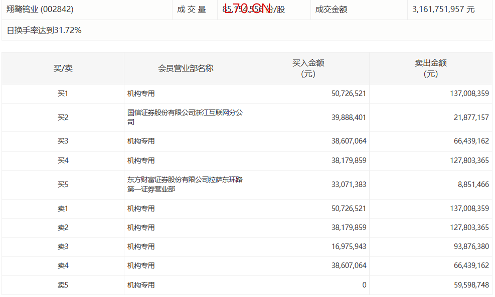 翔鹭钨业今日涨4.60%,有5家机构专用席位净卖出3.40亿元