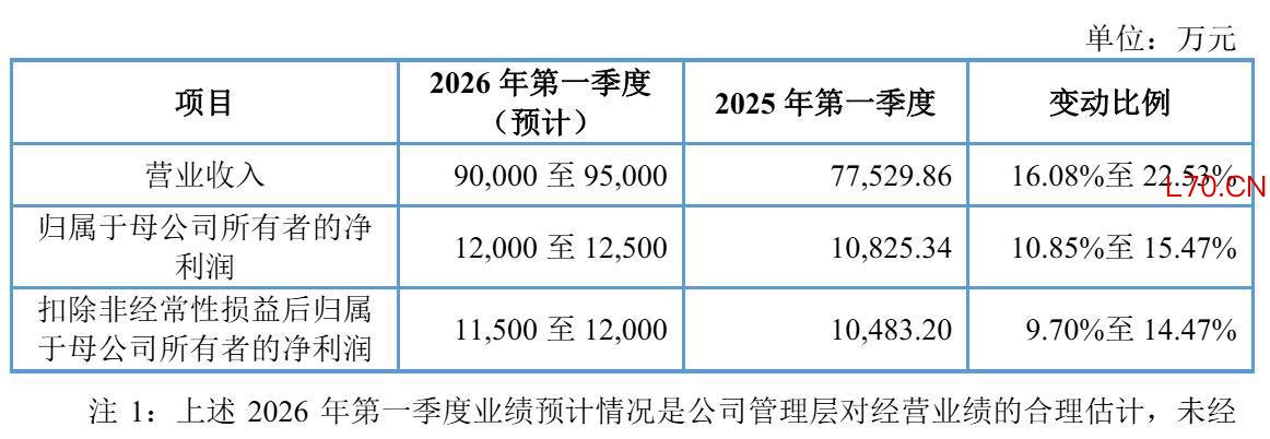 红板科技预计2026年第一季度营收为9亿到9.5亿,较上年同期的7.75亿元增长16%到22.53%;预计净利为1.2亿到1.25亿,较上年同期的1.08亿元增长10.85%到15.47%;扣非后净利为1.15亿到1.2亿,较上年同期的1.05亿增长9.7%到14.47%。
