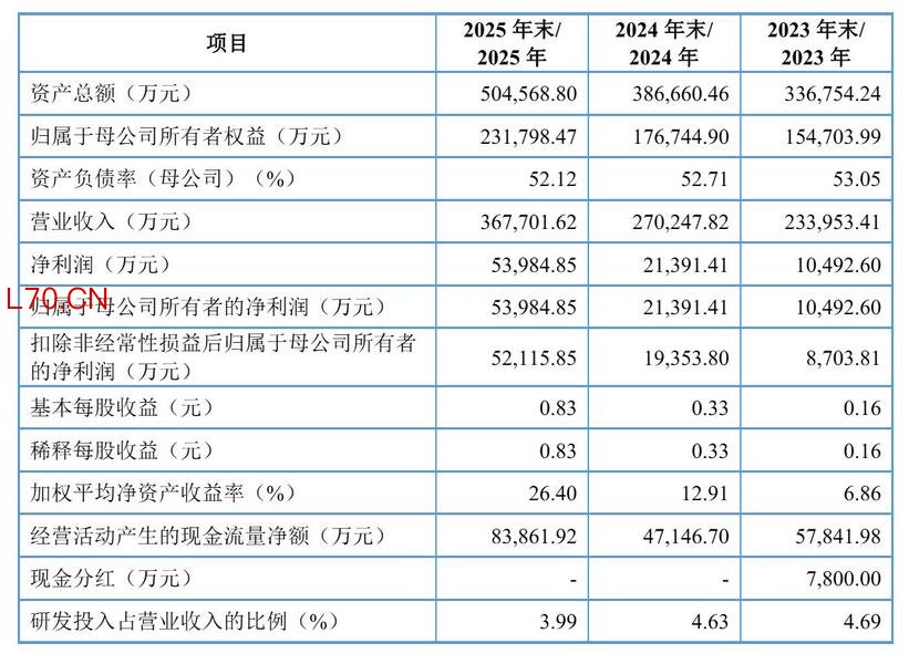 招股书显示,红板科技2023年、2024年、2025年营收分别为23.4亿元、27亿元、36.77亿;净利分别为1.05亿元、2.1亿元、5.4亿元;扣非后净利分别为8704万元、1.94亿元、5.21亿元。