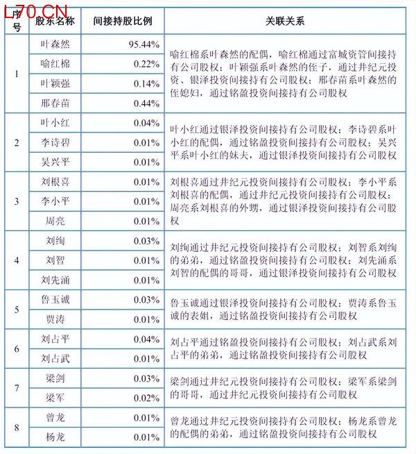 叶森然整体间接持股为95.44%,在剩下的4.56%股权中,叶森然的妻子喻红棉间接持股为0.22%,叶森然的侄子叶颖强间接持股为0.14%,叶森然的侄媳妇邢春苗持股为0.44%。