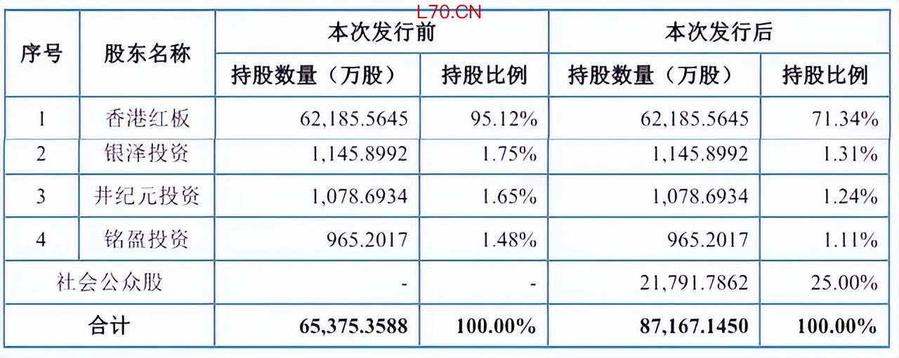 IPO后,香港红板持股为71.34%,银泽投资持股为1.31%,井纪元投资持股为1.24%,铭盈投资持股为1.11%。