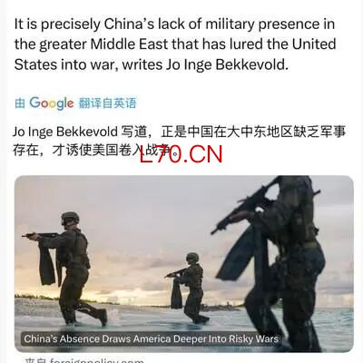 最后,说一件最近特别让人哭笑不得的事情。看到美国《外交政策》上的一篇文章,大致意思是:中国在中东地区缺乏军事存在,才诱使美国卷入战争……