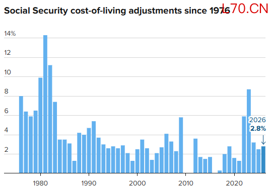 2026 年,约 7500 万社会保障金及补充保障收入受益人获得了 **2.8%** 的 COLA 涨幅。美国社会保障局 10 月表示,这使退休福利平均每月增加 56 美元。不过,具体涨幅会有差异,尤其是受医疗保险 B 部分保费年度上涨影响,该保费通常从月度福利金中扣除。