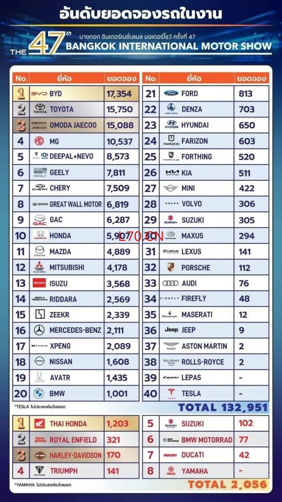 曼谷车展销量排行(数据来源:曼谷车展主办机构Grand Prix International Public Company Limited)