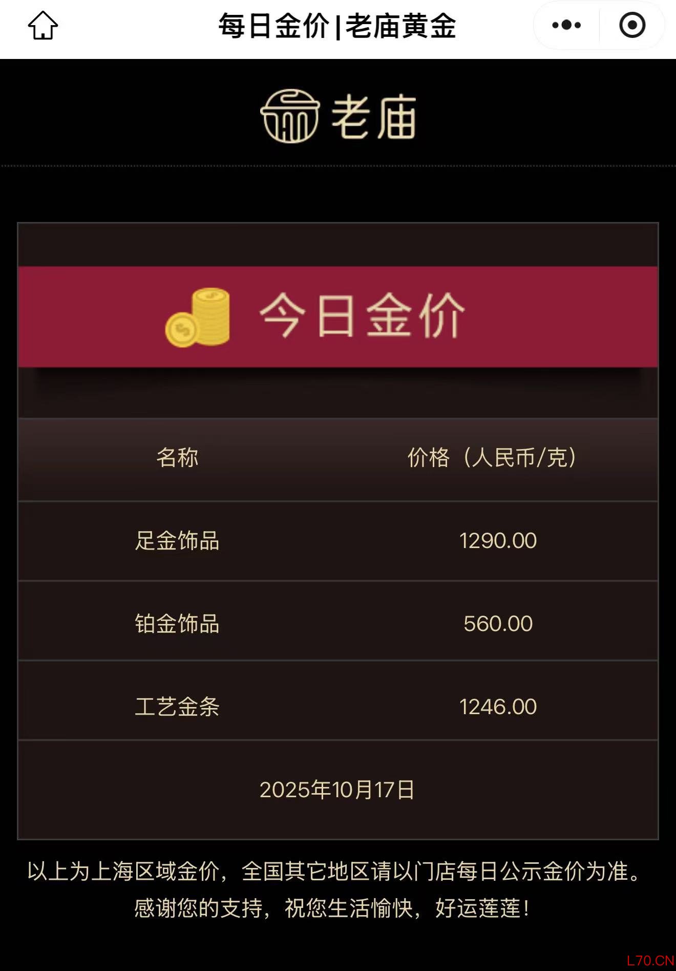 国内多家品牌金饰克价再涨,老庙黄金克价1290元