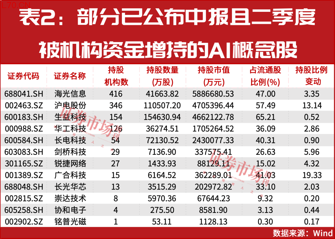 当前,上市公司中报正在如火如荼的披露中,结合已披露财报,多家AI概念股已经在二季度得到了各大机构的增持(见表2)。