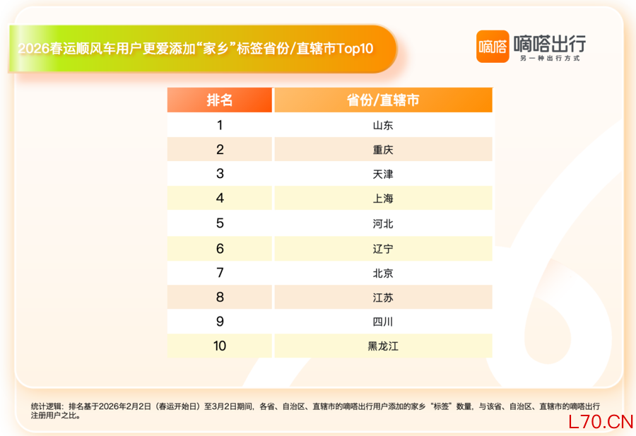嘀嗒顺风车大数据显示,自2月2日春运开始至今,用户添加的家乡标签数量已增长超过20%。而从2025年12月至今的3个月时间里,“家乡”标签的添加数量增长了129%。在各个省份、自治区及直辖市的嘀嗒出行用户中,平均每个用户添加家乡标签数量最多的省份/直辖市,前十依次是山东、重庆、天津、上海、河北、辽宁、北京、江苏、四川、黑龙江。