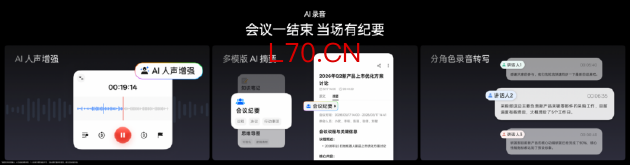 AI 功能方面,产品首次搭载系统级多功能快捷键,推出‘AI 一键闪记’功能,可完成语音记录、文档摘要、视频关键信息提取;AI 录音功能可区分发言人,生成多模板智能会议纪要。