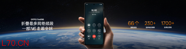 通信能力上,OPPO Find N6 搭载自研‘山海通信增强芯片’,配合双屏寄生增强技术、自适应激励天线架构和分布式通信增强架构,核心频段信号强度提升 100%。该机型总计支持 66 个通信频段,覆盖全球 230 多个国家和地区、1700 + 运营商。