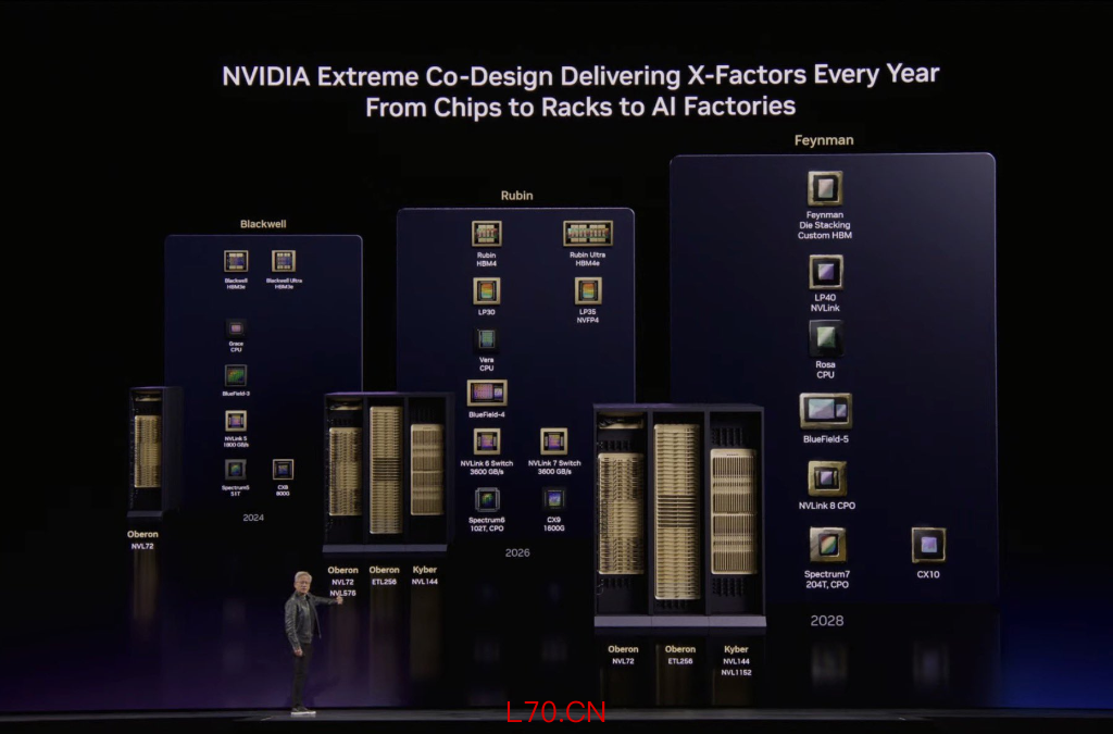 可以看到,芯片家族中不仅有大家平常熟知的CPU、GPU产品,还包括来自Groq的LPU,以及存储芯片、交换机芯片等全系产品。这些芯片又能够组成5款机架,在数据中心运行。