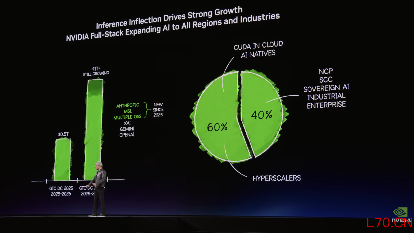 黄仁勋在演讲中预测,Blackwell与Rubin的AI芯片,到2027年底的收入将达到1万亿美元,相比去年10月的5000亿美元销售预测,已经翻倍。