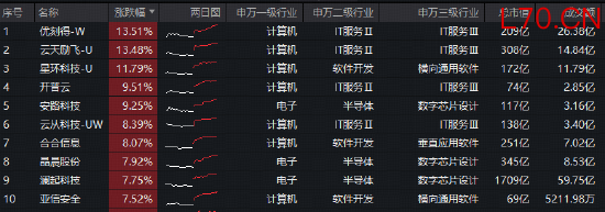 截至发稿,30只成份股全部涨超3%,,优刻得-W、云天励飞-U领涨超13%,星环科技-U涨逾11%,开普云、安路科技涨超9%,云从科技-UW、合合信息等个股跟涨。