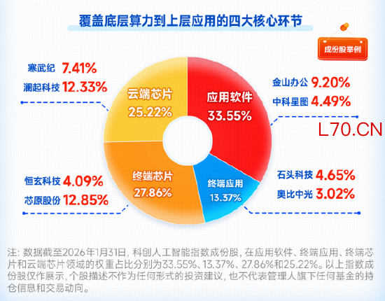科创人工智能ETF华宝(589520)及其联接基金(联接A:024560,联接C:024561)重点布局国产AI产业链,成份股囊括国产GPU龙头(如寒武纪),国产ASIC龙头(如芯原股份)、AI应用龙头(如金山办公),半导体行业权重占比近一半,具备较强进攻性;软件行业权重占比超三成,有望受益于AI应用补涨行情。同时,该ETF是融资融券标的,是一键布局国产算力的高效工具。