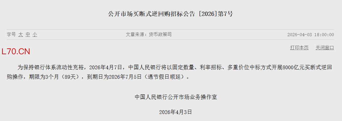 央行:4月7日将开展8000亿元买断式逆回购操作 期限为3个月