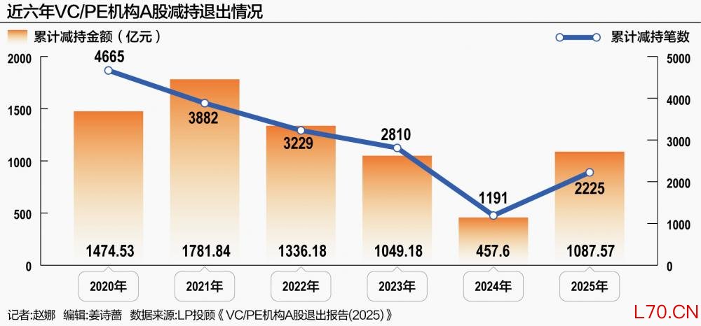 LP投顾最新报告显示,2020—2025年,1279家VC/PE机构在A股累计减持退出金额近7200亿元,减持退出笔数逾18000笔,涉及1563家上市公司。其中,2025年全年VC/PE机构减持退出总金额大幅回升至1087.57亿元,较2024年的457.60亿元同比激增137.67%,重回千亿级常态化减持规模。