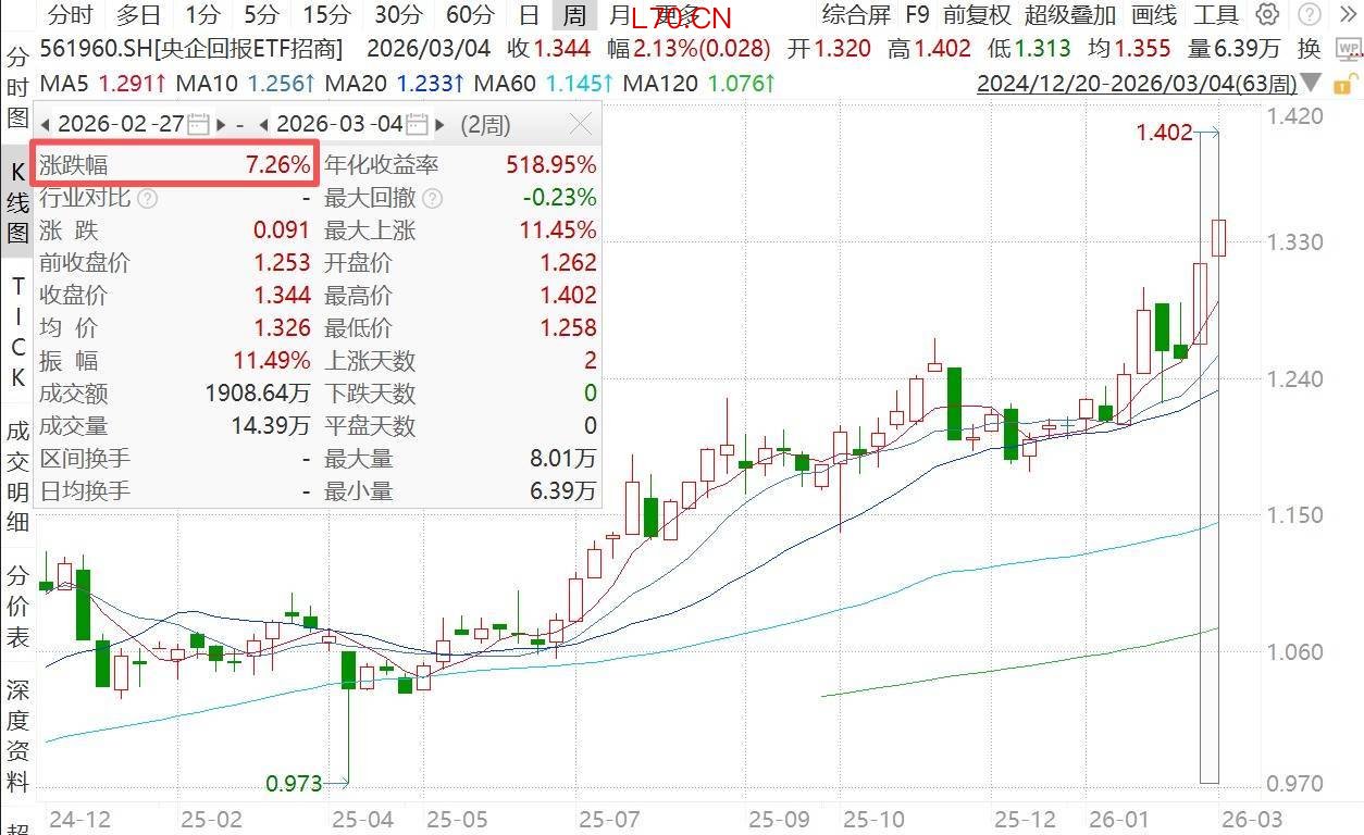 而央企回报ETF招商(561960),恰恰站在了这轮行情的风口上,其跟踪的央企股东回报指数在近期放大了核心成分股(中远海控、招商轮船、中国海油、中国石油、中国石化)的结构性机会,近两周涨幅高达7.26%。